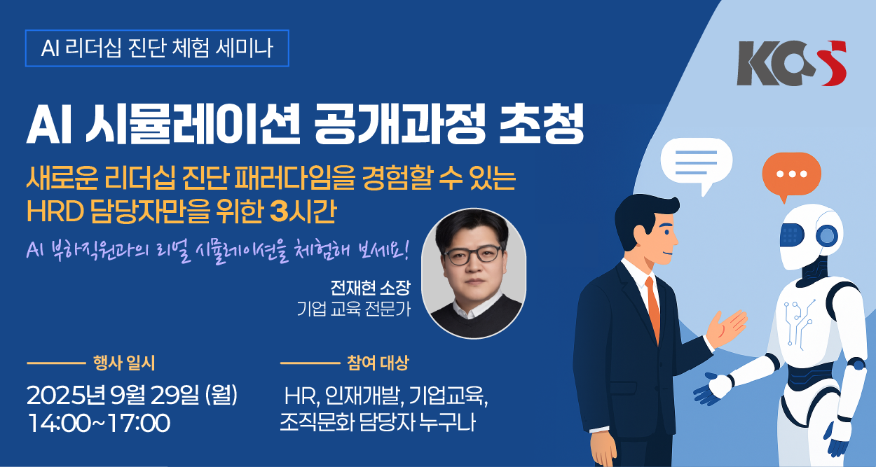 📅 일정 : 2025년 9월 29일(월) 14:00~17:00 (3시간) 👥 대상 : HR, 인재개발, 기업교육, 조직문화 담당자 등 관련 종사자 누구나! ✍️ 인원 : 선착순 25명 (조기 마감 예정) 📍 장소 : KOSS 교육센터 (서울 동작구 사당로 276 성보빌딩 6층, 이수역 7호선 도보 5분) 🅿 주차 지원은 제공되지 않는 점 양해 부탁드립니다. 대중교통 이용을 권장드리며, 차량 이용 시 인근 남성역 공영주차장을 이용해 주세요. 📞 문의 : 010-4728-7078 | ✉️ sgkim@ikss.kr | HRD교육본부 김승길 부장 본 과정은 AI App 활용 실습이 포함되어 있으므로, 개인 노트북을 반드시 지참해 주시기 바랍니다. |